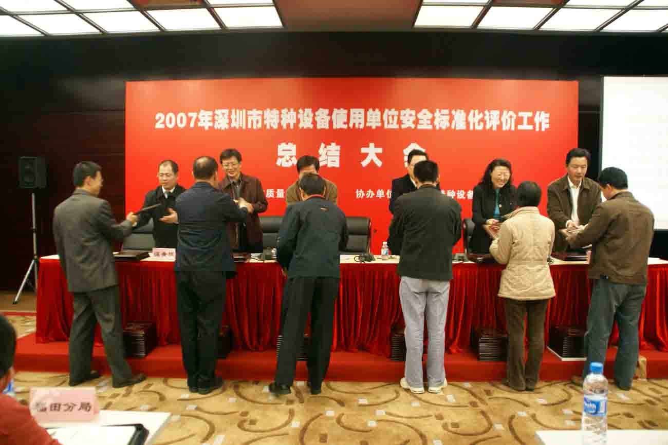 2007年12月26日,市質監局在深圳會展中心召開2007年深圳市特種設備使用單位安全標準化評價工作總結大會。市質監局張綺文局長、程學源副局長到會并講話。市質監局特設處和各分局有關工作人員、專家評價小組組長、市行業協會相關負責人和相關企業負責人共150余人參加了會議。